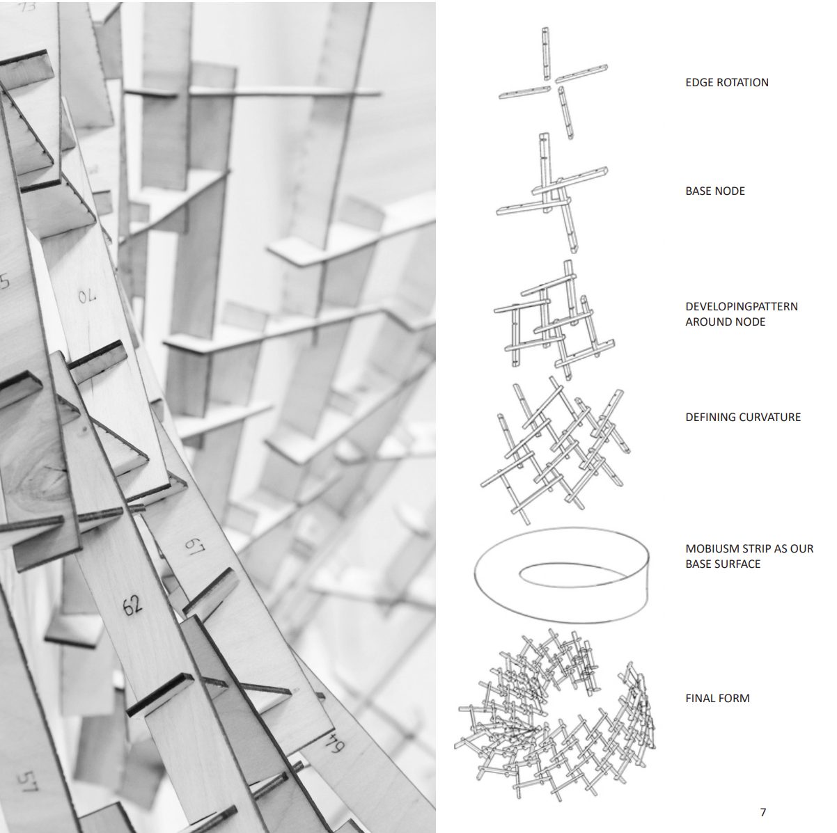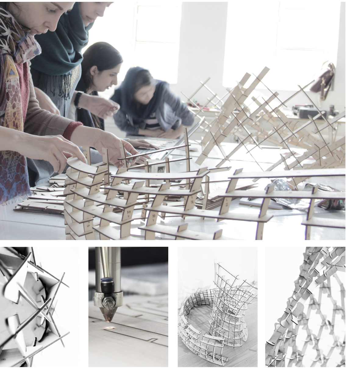 مجموعــه کارگاههــای ســازه هــای فضایــی فــرم آزاد بــا هــدف تحقیــق و تمریــن در میــان دو حــوزه ســازه هــای فــرم آزاد و روش هــای یکپارچــه طراحــی و ســاخت رایانشــی برگــزار میگردنـد. هـر یـک از ایـن برنامـه هـای آموزشـی بـه یـک روش و فـن خـاص در راسـتای سـاخت سـازه هـای فـرم آزاد مـی پـردازد. ایـن کارگاه بـا بررسـی سـازه هـای بسـتاربند تـلاش نمـوده تـا در زمـان سـه هفتـه سـازه ای از ایـن دسـته را طراحی کـرده و بسـازد. در ایـن مسـیر دانشـجویان در ابتـدا بـا تکنیـک آشـنا شـده و سـپس، بـا اسـتفاده از ابـزار سـاخت دیجیتـال طراحـی خـود را توسـعه داده و در مقیـاس واقعـی تولیـد کـرده انـد. تمامـی قطعـات ایـن سـازه از پالیـوود بـه ضخامـت دوازده میلیمتـر بـوده و بـا اسـتفاده از ابـزار سـاخت دیجیتـال بـرش خـورده انـد. سـپس بـه وسـیله میـخ بـه یکدیگـر متصـل شـده انـد.