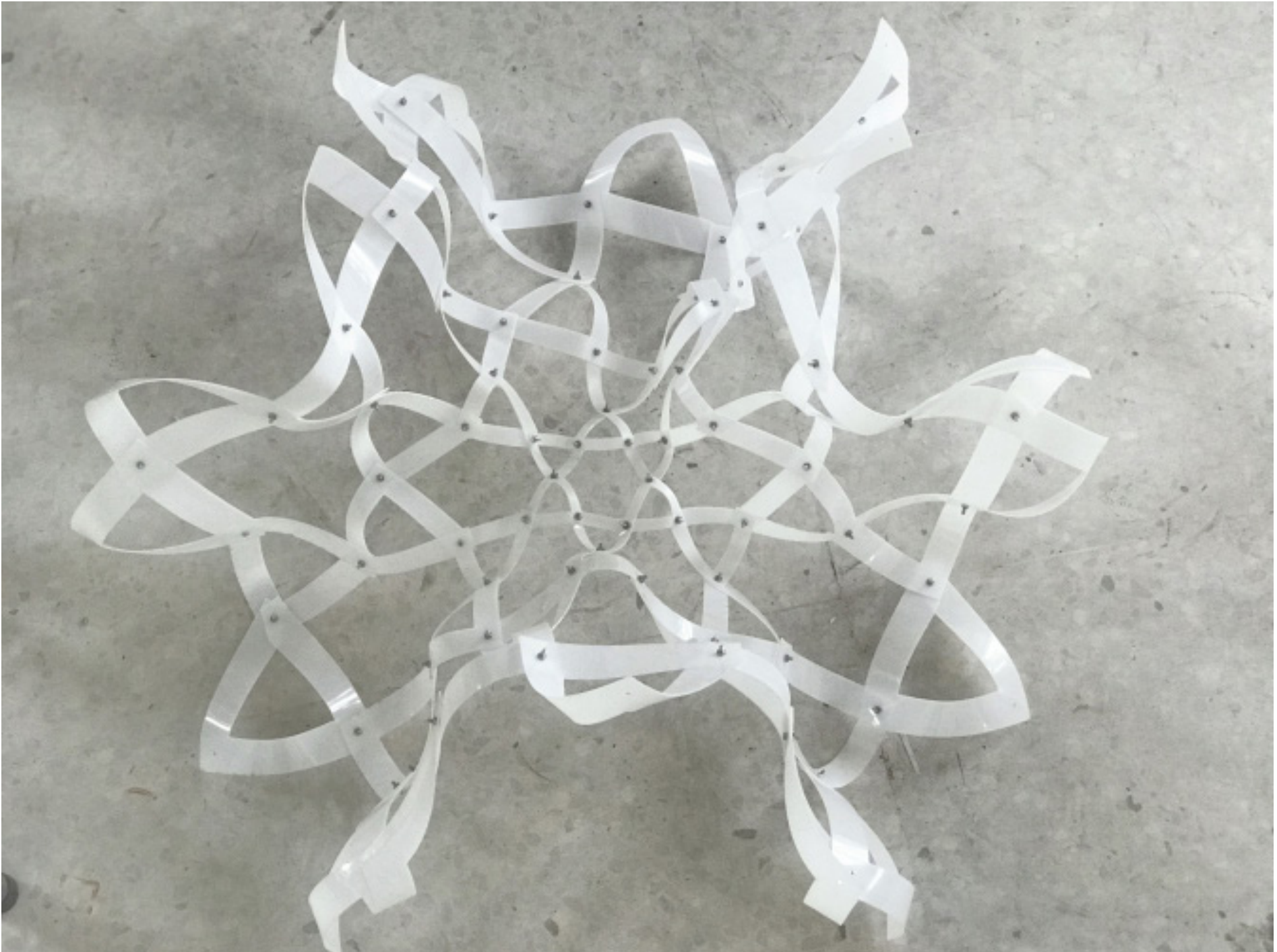 محصـول دوم ایـن کارگاه یـک سـازه آویـز بـوده کـه در سـالن نمایشـگاه دانشـکده هنرهـای زیبـای دانشـگاه تهـران نصـب گردیـده اسـت. ایـن سـازه از یـک مـدول سـه ضلعـی تشـکیل شـده کـه بـه صـورت یـک U بـا دو زاویـه 90 درجـه بـه شـکل تخـت تولیـد شـده و سـپس بـا رسـاندن دو سـر U بـه یکدیگـر بـه کمـک خـم کـردن اعضـا شـکل یـک مثلـث ورمکـرده را پیــدا میکنــد. بــا کنــار هــم قــرار دادن ایــن مثلثهــا میتــوان بــه یــک ســازه تخــت رسـید. در مرحلـه بعـدی بـا بـزرگ کـردن برخـی از مثلثهـا دانشـجویان تـاش کردنـد تـا فـرم سـه بعـدی را ایجـاد نماینـد. پـس از درک رفتـار ایـن سـازه تـاش شـد تـا الگوریتمـی در گرسهاپـر ایجـاد شـود تـا بتوانـد فـرم نهایـی را در فضـای دیجیتالـی شبیهسـازی کـرده و از ایـن طریـق ابعـاد هـر قطعـه را بـرای رسـیدن بـه فـرم نهایـی تعییـن کنـد. پـس از تهیـه نقشـههای سـاخت و بافـت، قطعـات از تختـه سـه الیـی سـه میلیمتـری بـرش خوردنـد تـا آمـاده نصـب گردنـد. در ایـن مرحلـه تمامـی قطعـات در راسـتای عمـود بـر چـوب بـرش خوردنـد تـا راحتتـر خـم شـوند.
