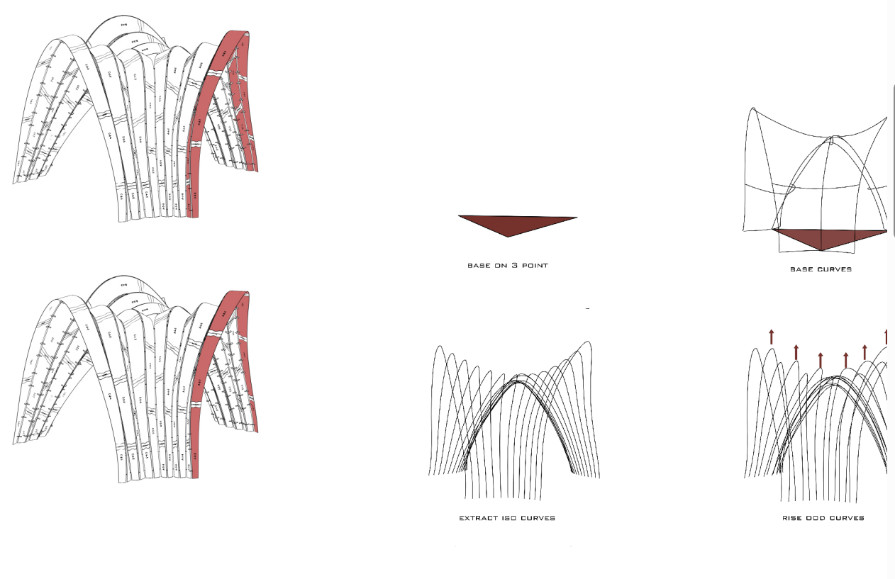 در مرحلــه صفــر کارگاه، پیــش از شــروع دوره آموزشــی روشهــای مختلفــی بــرای ســاخت ایـن نـوع از سـازهها امتحـان گردیـد و انـواع مختلـف مصالـح از نظـر توانایـی تغییـر شـکل االســتیک و توانایــی بــرش بــا دســتگاههای ســاخت دیجیتــال مــورد آزمایــش قــرار گرفــت. در نتیجـه ایـن فرآینـد »مقـوا و هـای ایمپکـت پلـی اسـتایرن« بـه عنـوان مصالـح مطلـوب نمونـه سـازی و تختـه چنـدال بـا ضخامتهـای مختلـف جهـت اسـتفاده در کار نهایـی انتخـاب گردیدنـد. مرحلـه اول ایـن کارگاه شـامل دو بخـش آمـوزش و تجربـه بـود. بـه گونـهای کـه در بخـش آمــوزش بــه دانشــجویان نرمافــزار گرسهاپــر بــه عنــوان ابــزار طراحــی دیجیتــال و معرفــی تجهیـزات بـه عنـوان ابـزار سـاخت دیجیتـال معرفـی گردیـد تـا بتواننـد از پتانسـیلهای آن در طراحـی خـود اسـتفاده نماینـد. سـپس در بخـش تجربـه از دانشـجویان خواسـته شـد تـا تـاش کننـد بـا خـم کـردن ورقهـا یـک مـدول یـا قسـمتی از یـک سـازه خـم فعـال را بسـازند. در ایـن قسـمت دانشـجویان موفـق شـدند تـا هفـت مـدل اولیـه متفـاوت طراحـی نماینـد. در مرحلــه بعــد، ســه سیســتم مختلــف بــه عنــوان گزینههــای اصلــی انتخــاب شــدند و دانشـجویان در سـه گـروه بـه مطالعـه و توسـعه طـرح پرداختنـد. خروجـی ایـن قسـمت ماکـت یـک پنجـم کل و یـا بخشـی از کار نهایـی بـود بـه گونـهای کـه ایـن اطمینـان حاصـل شـود کـه هـر گـروه فرآینـد تولیـد یـک پاویـون را در مقیـاس ماکـت بـه صـورت دیجیتالـی و بـا جزئیـات مشـابه کار نهایـی تجربـه خواهـد نمـود. در آخریــن مرحلــه دو اثــر از ســه گزینــه موجــود بــا رای دانشــجویان انتخــاب گردیــد و در مقیــاس واقعــی ســاخته شــد. تولیــد نقشــههای ســاخت ایــن قســمت تمامــا توســط کــد در نرمافــزار گرسهاپــر انجــام گردیــد و تمــام قطعــات توســط دســتگاه بــرش milling CNC و بــرش لیــزر تولیــد گشــت.