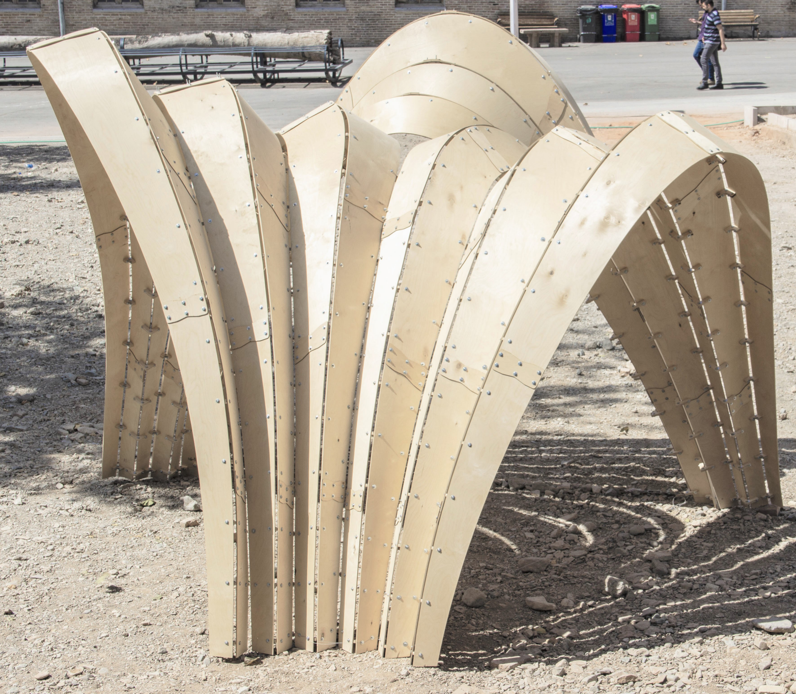 مجموعــه کارگاههــای ســازههای فضایــی فــرم آزاد بــا هــدف تحقیــق و تمریــن در میــان دو حــوزه ســازههای فــرمآزاد و روشهــای یکپارچــه طراحــی و ســاخت رایانشــی برگــزار میگردنــد. هــر یــک از ایــن برنامههــای آموزشــی بــه یــک روش و فــن خــاص در راســتای سـاخت سـازههای فـرم آزاد میپـردازد. ایـن کارگاه بـا بررسـی سـازههای سـطح فعـال و خـم فعـال تـاش نمـوده تـا در زمـان سـه هفتـه دو سـازه متفـاوت از ایـن دسـته را طراحـی کـرده و بسـازد. در ایـن مسـیر دانشـجویان در ابتـدا بـا مطالعـه مصالـح و شـناخت رفتـار آن روشهایـی را جهـت توسـعه فـرم ایجـاد نمودهانـد. سـپس، بـا اسـتفاده از ابـزار سـاخت دیجیتـال طراحـی خــود را توســعه داده و در مقیــاس واقعــی تولیــد کردهانــد. تمامــی قطعــات ایــن دو ســازه از پالیـوود بـا ضخامتهـای سـه و شـش میلیمتـر بـوده و بـا اسـتفاده از ابـزار سـاخت دیجیتـال بـرش خوردهانـد. سـپس بـه کمـک اعمـال نیـرو و اسـتفاده از ویژگـی االسـتیک مصالـح خـم شـده تـا بـه شـرایط و فـرم نهایـی خـود برسـند.