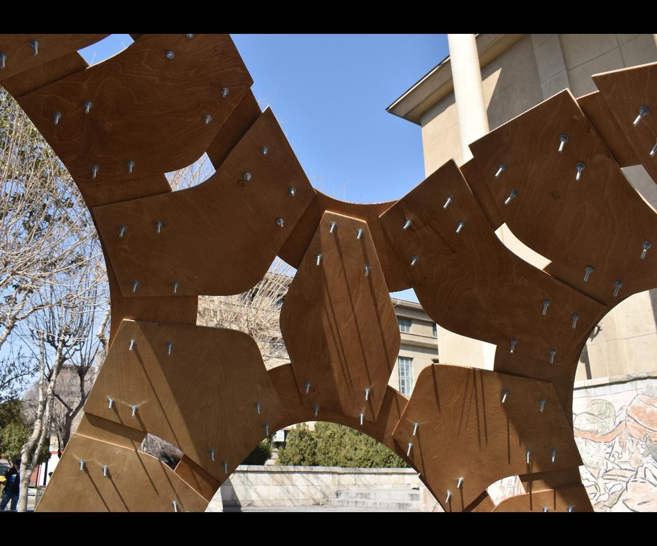 دانشجویان در ابتدا به ساخت نمونههای کوچک آزمایشی اقدام نموده و پس از تحلیل نمونهی ساخته شده در این مقیاس، با انجام اصلاحاتی، اقدام به ساخت نهایی پاویون در مقیاس یک به یک و با متریال پلای وود نمودند.