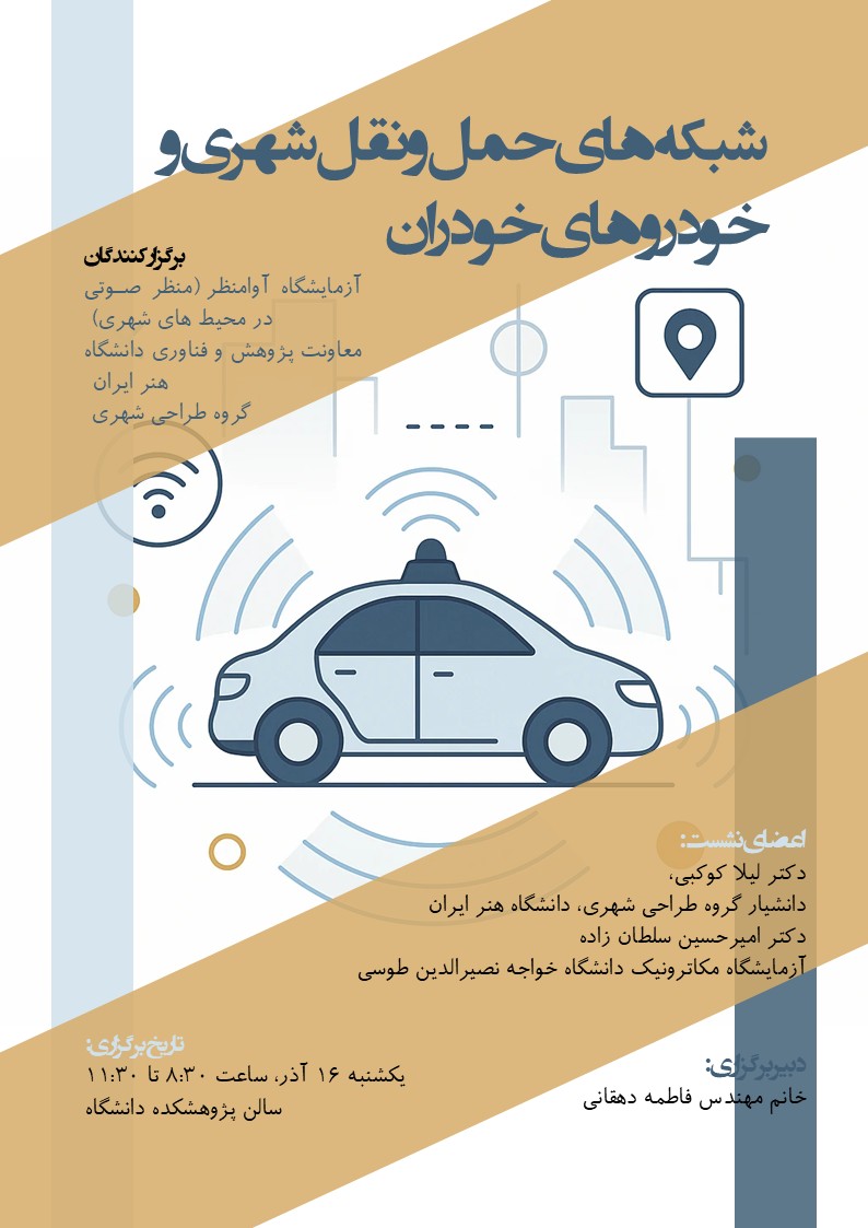 یکشنبه ۱۶ آذر ۱۴۰۴، سالن پژوهشکده دانشگاه هنر ایران میزبان نشست علمی و کارگاه آموزشی با عنوان «شبکههای حملونقل شهری و خودروهای خودران» بود. این رویداد با همکاری آزمایشگاه آوامنظر (منظر صوتی در محیطهای شهری)، معاونت پژوهش و فناوری دانشگاه هنر ایران، و گروه طراحی شهری برگزار شد. دبیر برگزاری نشست خانم مهندس فاطمه دهقانی بودند.